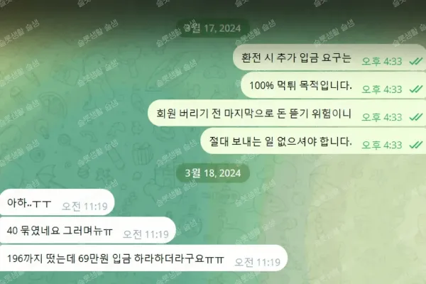 2024년 3월 16일, '삽입매니아' 님의 다급한 제보였습니다. 담당자는 즉시 연락을 취해 "환전 시 입금 요구는 100% 먹튀"라는 점을 명확히 고지하고 관련 칼럼 링크를 전달했습니다. 다행히 69만 원의 추가 입금을 막아내어, 충전 원금 40만 원만 잃는 선에서 피해를 최소화할 수 있었습니다.