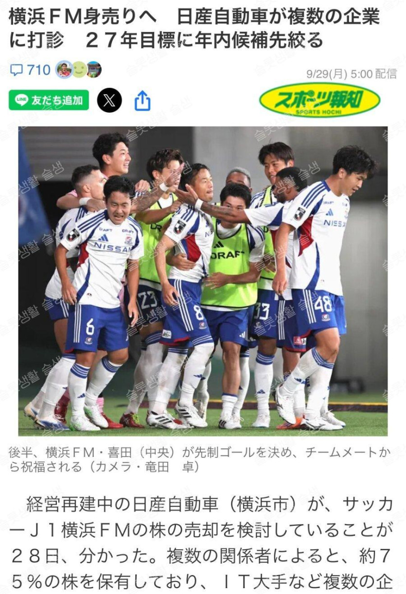 경영재건중인 닛산자동차 (요코하마시) 가 J리그 요코하마 마리노승 주식 매각하는것을 검토하고있다고 28일 밝혀졌다. 복수의 관계자에 따르면 약 75%의 주식을 보유하고 있는데, 복수의 IT대기업을 상대로 매각을 타진하고있다. 교섭이 진행된다면, 2027년을 목표로 클럽을 양도한다. 1972년 창단이래 일본 축구계를 이끌어온 전통의 팀이 클럽운영에 매듭을 짓는것이다.