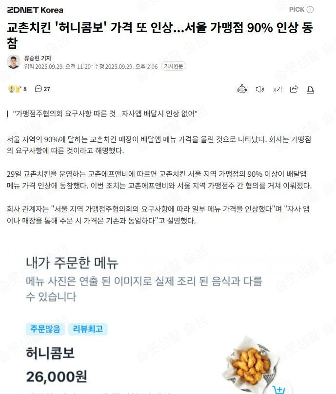 교촌치킨 '허니콤보' 가격 또 인상...