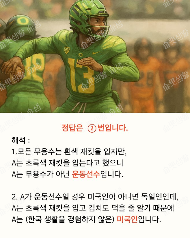 한국생활 경험을 안한 운동선수니까 초록 재킷을 입었는데, 독일인은 한국생활을 안하면 김치먹을 수 없음. 즉 독일인 운동선수는 초록자켓을 입을 수 없음.