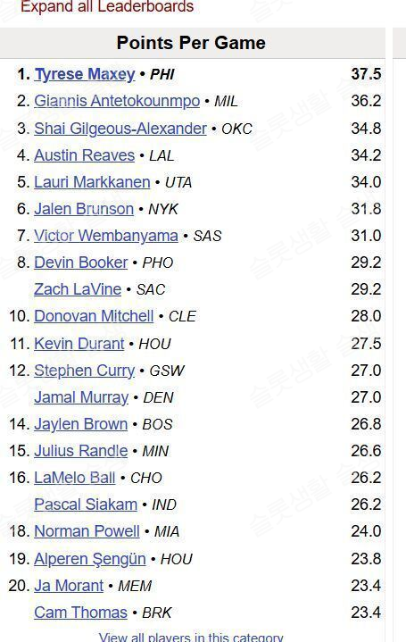 선수들 득점 돌았긴하네요 ㅋㅋㅋ 저 뒤로도 20명있음 평득 20.3인 니콜라 조키치가 39위