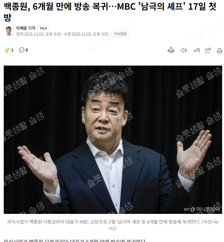 [자유게시판] 백종원 방송 복귀하네요 ㄷㄷㄷ2025-11-06