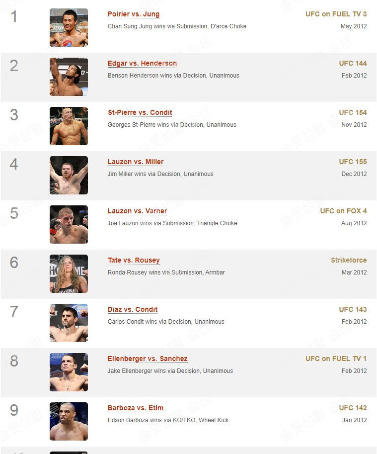 정찬성 포이리에 경기는 탭폴로지 선정 2012년 올해의 경기로 손꼽힘