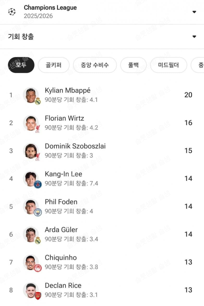 이강인 챔스 기회창출 4위