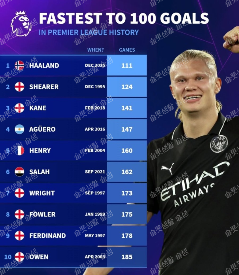 111경기만에 100골로, 1995년 12월 앨런 시어러가 작성한 124경기 100골 기록을 30년만에 깨고 EPL 역대 최소 경기 100골 신기록 작성