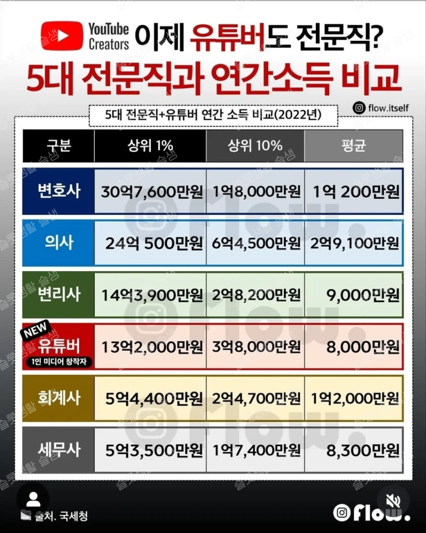 5대 전문직 사이에서도 안꿀리는 유튜버 수입