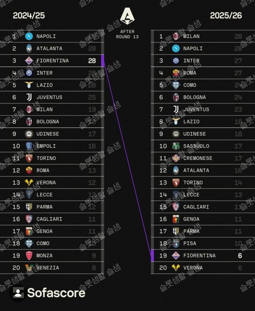 한시즌만의 망한 피오렌티나 순위