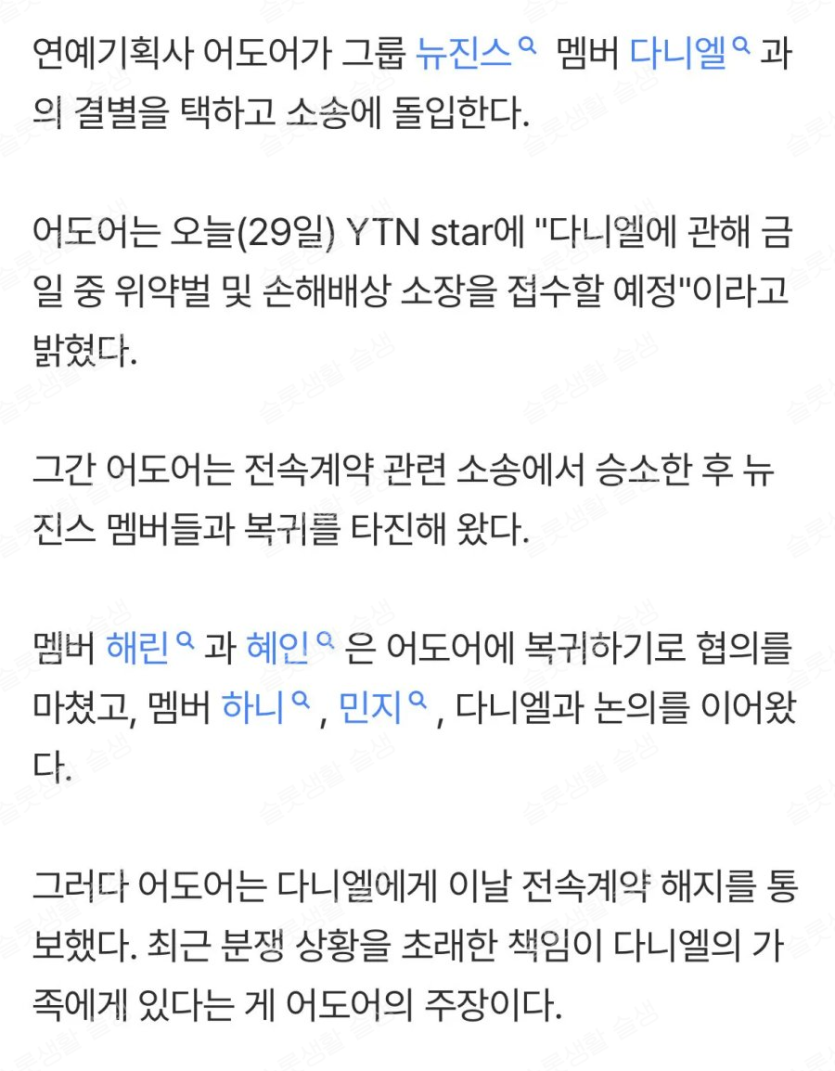 어도어, 다니엘에 위약벌·손해배상 청구한다