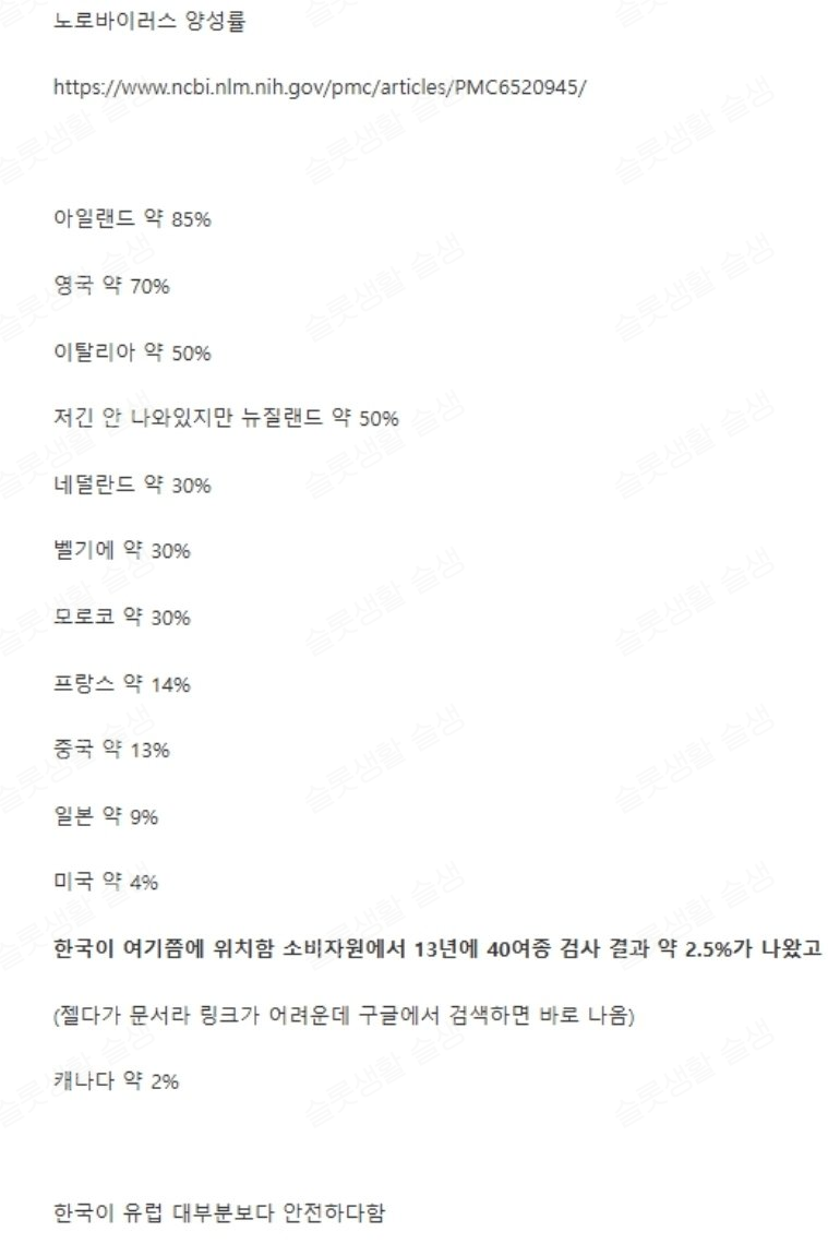 굴에 있는 노로바이러스 양성율 한국과 외국 비교