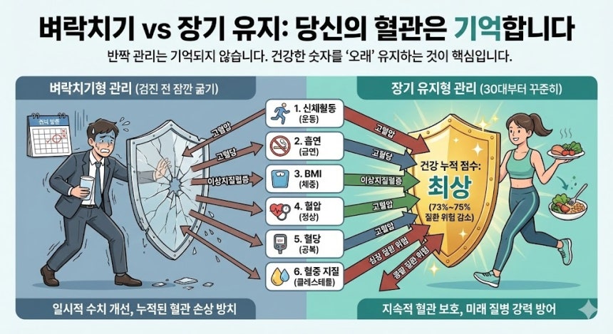 평가 항목은 신체활동, 흡연, 체질량지수, 혈압, 혈당, 혈중 지질 등 6가지다. 흔히 병원에서 읊어주는 지루한 ‘기초 검사’ 지표들이지만, 이 숫자가 십수 년간 누적된 결과의 무게는 결코 가볍지 않았다.