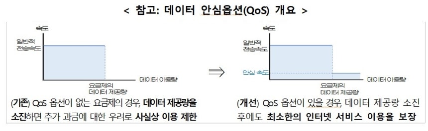 개편안의 핵심은 모든 LTE·5G 요금제에 별도 요금 인상 없이 '데이터 안심옵션(QoS)'을 포함하는 것이다. 기존에는 데이터 제공량을 소진하면 추가 요금이 부과된다는 우려로 이용을 사실상 꺼려했었는데, 앞으로는 소진이 되더라도 기본적인 메신저 이용, 지도 검색 등이 가능한 수준의 인터넷 이용이 보장된다.