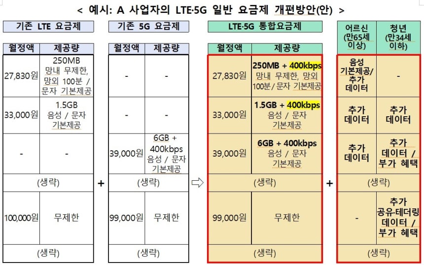 | ▲ 예시: A 사업자의 LTE·5G 일반 요금제 개편방안(안) |