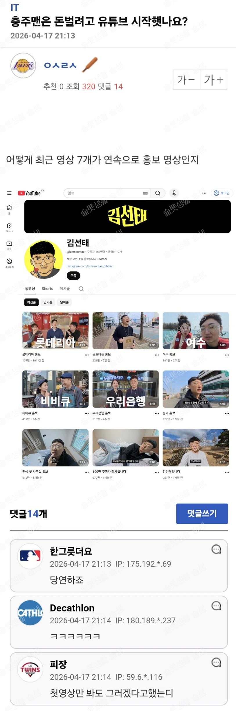 김선태는 돈 벌려고 유튜브 하나요?