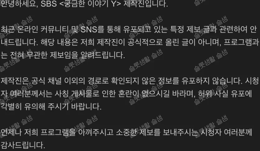 SBS 궁금한 이야기 Y 허위사실 공지문 올라옴