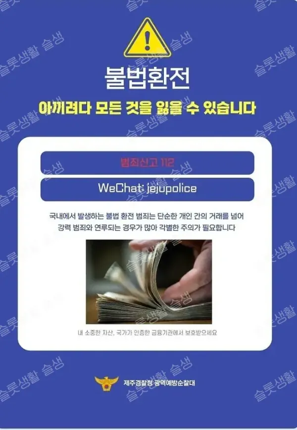 23일 제주경찰청 광역예방순찰대에 따르면, 금융기관 이용이 어려운 불법체류자나 송금 한도를 초과한 고액을 몰래 본국으로 보내려는 카지노 이용객이 불법 환전 범죄의 주요 표적이 되고 있다. 경찰은 불법 환전상들이 사채업까지 겸하면서 강력 범죄로 이어지는 사례가 빈발하고 있다고 파악했다.