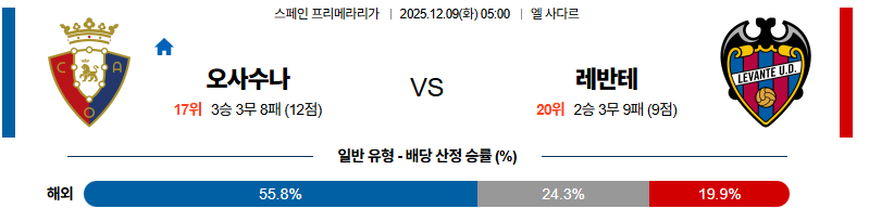 12월09일 레반테:오사수나 라리가 분석 및 예측