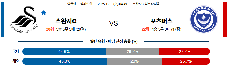 12월10일 스완지시티:포츠머스 잉글랜드챔피언쉽 분석 및 예측