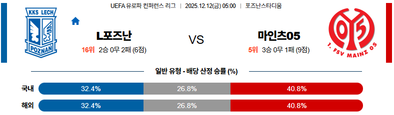 12월12일 레흐포즈난:마인츠 UEFA유로파리그 분석 및 예측