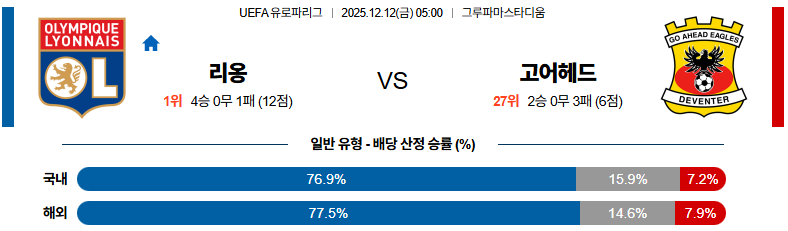 12월12일 올랭피크리옹:고어헤드이글스 UEFA유로파리그 분석 및 예측