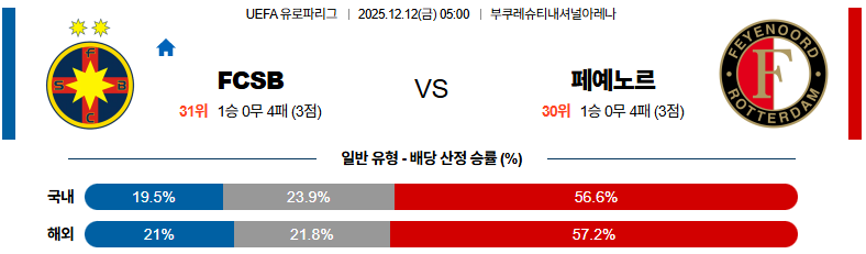 12월12일 FCSB:페예노르트 UEFA유로파리그 분석 및 예측