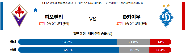 12월12일 디나모키이우:피오렌티나 UEFA유로파컨퍼런스 분석 및 예측