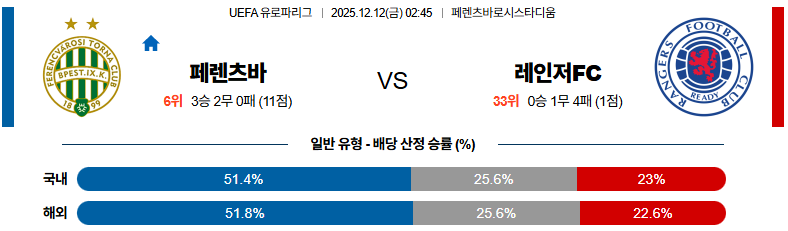 12월12일 페렌츠바로시:레인저스 UEFA유로파리그 분석 및 예측