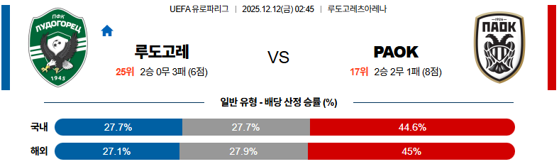 12월12일 루도고레츠:PAOK UEFA유로파리그 분석 및 예측