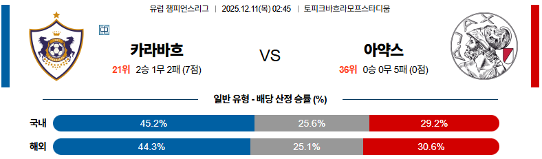 12월11일 카라바흐:아약스 UEFA챔피언스리그 분석 및 예측