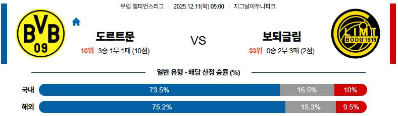 12월11일 도르트문트:보되글림트 UEFA챔피언스리그 분석 및 예측
