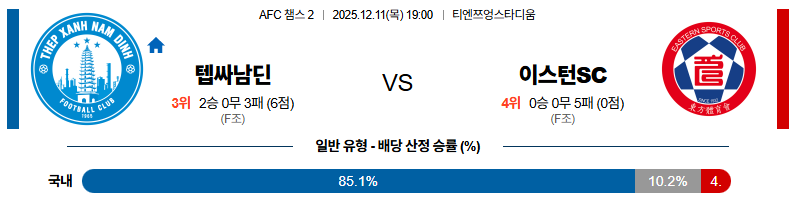 12월11일 남딘:이스턴SC AFC챔피언스리그2 분석 및 예측