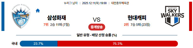 12월11일 삼성화재:현대캐피탈 V리그 분석 및 예측