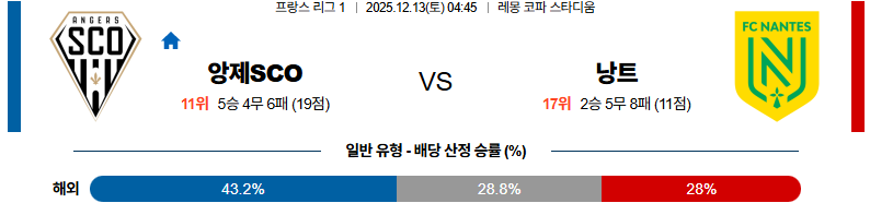 12월13일 앙제:낭트 리그앙 분석 및 예측