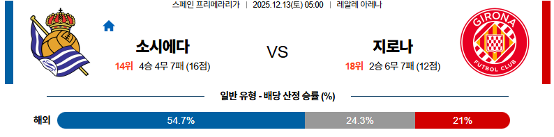 12월13일 레알소시에다드:지로나 라리가 분석 및 예측