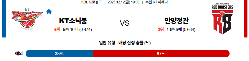 12월12일 수원KT:안양정관장 KBL 분석 및 예측