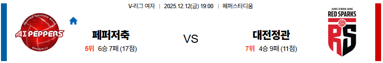12월12일 페퍼저축은행:정관장 V리그(여) 분석 및 예측
