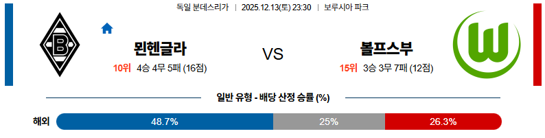 12월13일 묀헨글라트바흐:볼프스부르크 분데스리가 분석 및 예측