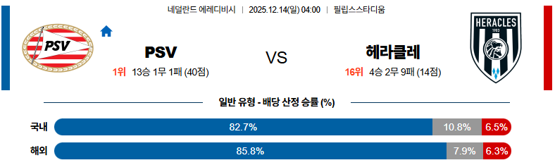 12월14일 아인트호벤:헤라클레스 에레디비지 분석 및 예측