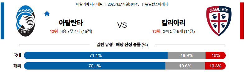 12월14일 아탈란타:칼리아리 세리에A 분석 및 예측