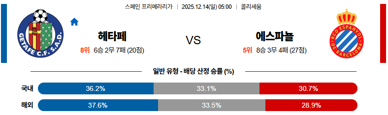 12월14일 헤타페:에스파뇰 라리가 분석 및 예측