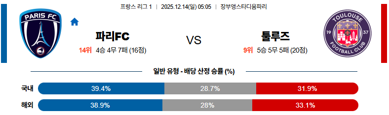 12월14일 파리FC:툴루즈 리그앙 분석 및 예측