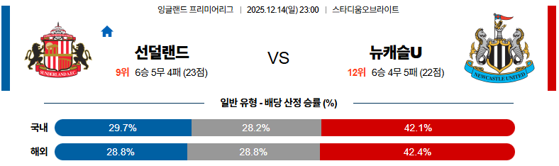 12월14일 선덜랜드:뉴캐슬 프리미어리그 분석 및 예측
