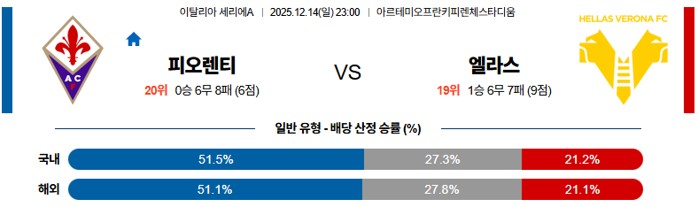 12월14일 피오렌티나:엘라스베로나 세리에A 분석 및 예측