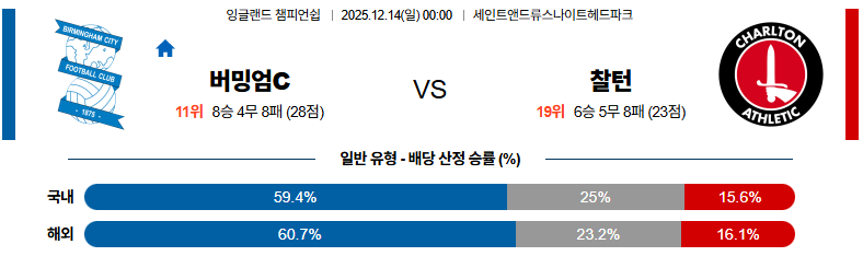 12월14일 버밍엄시티:찰튼 잉글랜드챔피언쉽 분석 및 예측
