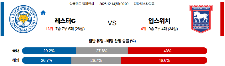 12월14일 레스터시티:입스위치 잉글랜드챔피언쉽 분석 및 예측