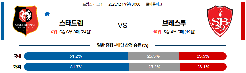 12월14일 스타드렌:브레스트 리그앙 분석 및 예측