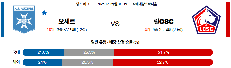 12월15일 오세르:릴 리그앙 분석 및 예측