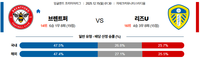 12월15일 브렌트퍼드:리즈 프리미어리그 분석 및 예측
