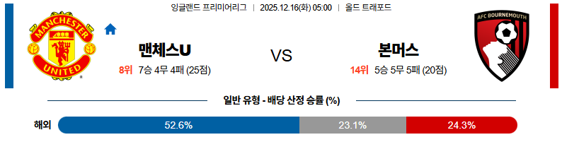 12월16일 맨유:본머스 프리미어리그 분석 및 예측