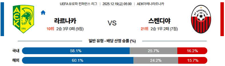 12월19일 라르나카FC:슈켄디야 UEFA유로파컨퍼런스 분석 및 예측