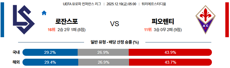 12월19일 로잔:피오렌티나 UEFA유로파컨퍼런스 분석 및 예측